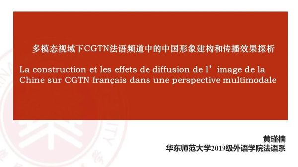 19级黄瑾楠同学的论文« La construction et les effets de diffusion de l’image de la Chine sur CGTN français dans une perspective multimodale »(《多模态视域下CGTN法语频道中的中国形象建构和传播效果探析》)以CGTN法语频道YouTube平台上的前50个热门视频及其相应的10808条法语评论为研究对象,结合框架理论与张德禄提出的多模态话语分析理论框架,将视频既作为一种媒介从业者生产的新闻报道来把握和理解,又从语言学角度视其为一种由多种模态构成的话语进行微观的分析,探究视频中的图像、文本、声音等多种模态各自的话语特征以及它们之间的相互作用,还进一步分析了法语受众的评论,理解法语受众的特点、兴趣点、关注点及热门视频对其产生的影响,从而为我国主流媒体面向法语受众与地区的对外传播提供更加具体的优化建议。