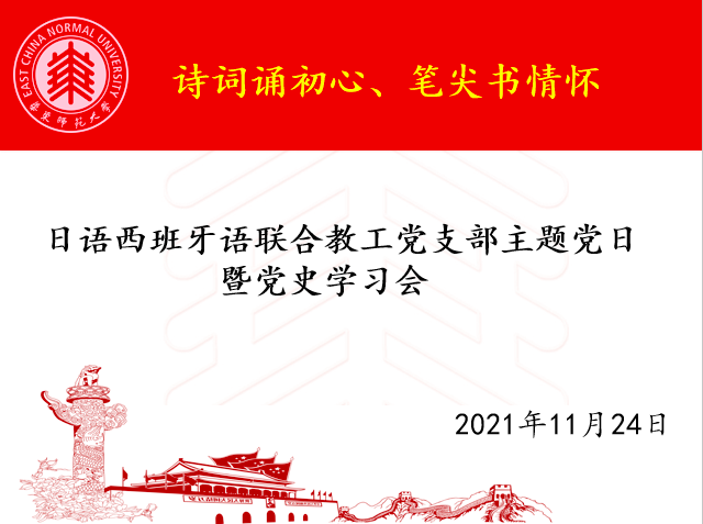 日语、西班牙语联合教工党支部一贯重视支部党员的党史学习教育。为发挥每一位党员的主观能动性,力求将党史教育学活、学实、学深,2021年11月24日下午,支部以“诗词诵初心、笔尖书情怀”为主题,以吟诵和书写毛泽东同志的党史相关诗词为内容,开展主题党日暨党史学习会。