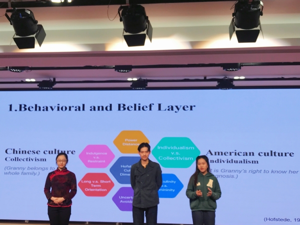 由于疫情防控,本届比赛决赛调整为案例展示分析及评委问答两个环节。我校参赛团队演绎的案例改编自电影《别告诉她》,影片讲述了华人二代移民碧梨回国后得知奶奶确诊肺癌晚期,深受西方价值观念影响的碧梨觉得应该要告诉奶奶实情,而中国的家人却都选择隐瞒,这让碧梨倍感困惑。围绕“要不要告诉奶奶病情”这一核心矛盾,同学们分析了其内在层面的中西文化差异,进一步揭示华人二代移民在身份认同上遇到的两难困境,最后提出可以通过加强“华人性”实现文化融合。同学们生动的演绎、精彩的表述、深刻地思考引发评审一致好评。