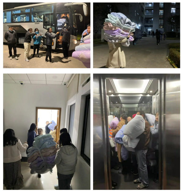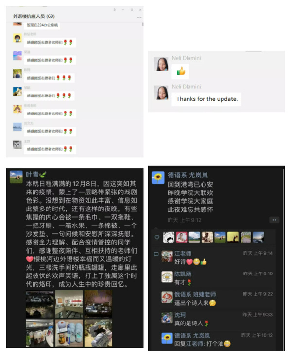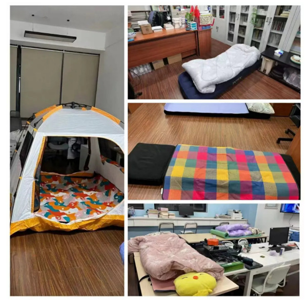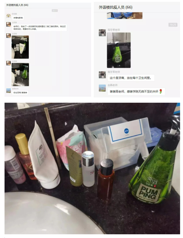 “我在洗手间放置了洗面奶和其它女性用品,请有需要的老师自取!”在这个不同寻常的夜晚,同事们相亲相爱,互帮互助,各种生活用品应有尽有;校外的教授们贡献了办公室的沙发,校内的老师们充分发挥创造力,打造多彩的“寝室生活”;学院领导逐一落实走访楼内70余位教职员工的住宿情况……一句句暖心话语,一次次志愿行动,一件件友爱分享,都让人感动满满,记忆深刻。