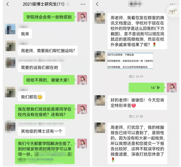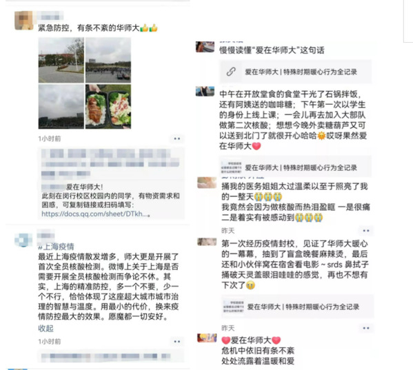 正在中北校区召开思政年会的学工团队即刻返回闵行与学生一起面对疫情管控,成为“逆行者”,她们实时统计校内外学生情况、第一时间发布校园生活、核酸检测、宿舍管理等信息,安置暂时无法返回宿舍的学生,点对点帮助学生解决实际困难,为学生筑起温暖屏障。