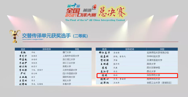 2021年12月16日,第十届全国口译大赛(英语)总决赛在线上落下帷幕,bwin必赢国际中国官方网站2021级MTI口译方向研究生陈悦获交替传译单元全国总决赛二等奖。