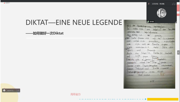 德语系2021级本科生陈诗颖主要分享了自己的德语听力提升技巧和学习资源。关于听力提升,她着重分享了“Diktat”这一方法;在听力资源分享中,她介绍了自己使用的“每日德语听力”“外研随身听”等学习APP,“DCL中德小队”“草莓德语”等学习公众号,以及B站上一些优质学习资源,如Nicos Weg等,并以DWDS这一查词网页为例介绍自己如何利用工具促进德语学习。