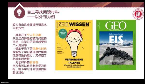 德语系2020级本科生金怡辰主要分享了如何用好外刊资源构建词汇银行、理解德语长难句这一德语学习技巧。她认为,学习者自主寻找语言阅读材料是一种自由且全面提升语言水平的方式,既能结合学习者兴趣提升学习自主性又能锻炼信息收集和信息筛选的能力,保证学习材料时效性。接下来,她以一篇外刊为例,展示了她如何通过整体阅读、提前标注关键词句、解析长难句并构建自己的词汇银行来完成一篇语言材料的自主学习。