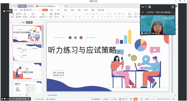 法语系2021级硕士研究生喻新雅主要围绕听力训练的方法和应试技巧展开。关于听力训练的方法,她提到采用听写作为精听训练方法,并分享了相关的精听材料资源。关于听力应试策略,她介绍了提前了解听力题型、调整心态、提前阅读题目、有目的地预测等方面的策略,并建议在考前可以适当选取简单的题目进行听力练习,增强信心的同时帮助快速进入听力考试状态。