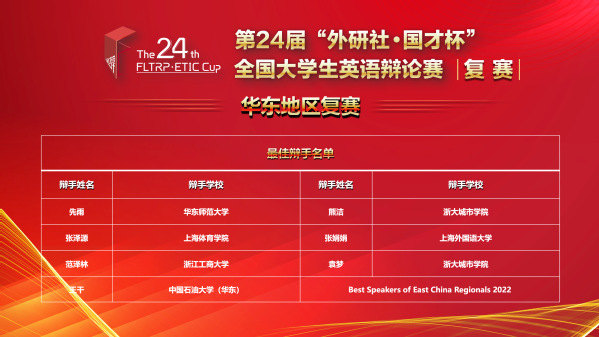 2022年4月9日至10日,第二十四届“外研社·国才杯”全国大学生英语辩论赛华东地区大区赛顺利举办,来自122所高校的244名辩手进行了为期2天、连续5轮辩论的激励比拼。最终,在bwin必赢国际中国官方网站赵朝永教授指导下,我校代表队选手马心怡(2021级外国语言学及应用语言学专业硕士研究生)和先雨(2019级英语专业本科生)总积分在122个队伍中排名第7名,取得华东地区赛“一等奖”的好成绩,晋级全国总决赛。与此同时,先雨同学还获得了“最佳辩手”的荣誉称号(244位选手中共评选7位)。