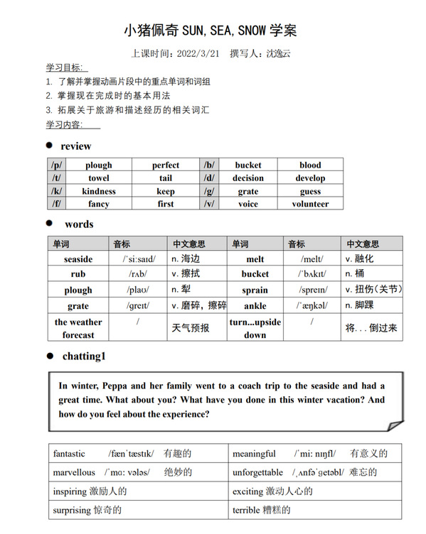 在前几轮支教内容的基础上,本学期教学计划紧抓课本知识点巩固,结合课外知识拓展,综合教学计划安排,内含语法知识,词汇搭配,音标复习和口语练习,旨在全方面发展学生的英语水平。尤其在口语方面,力求以听促说,以读促说,争取提升当地学生的口语表达能力。