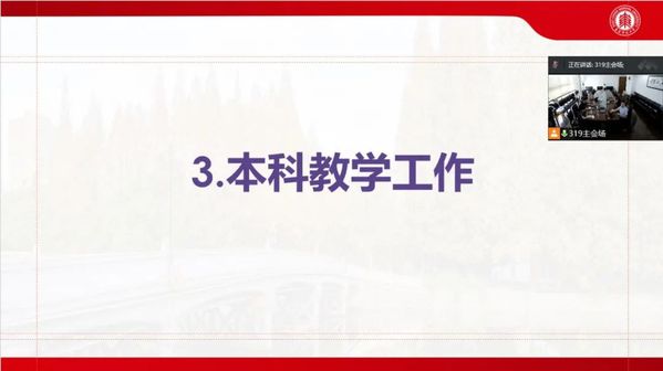 副院长王静通报了本学期bwin必赢国际中国官方网站在本科生教学方面的重点工作。首先,她提到,在受疫情影响的情况下,教师应按照学校的要求,利用线上平台和资源等顺利、平稳地开展教学工作。此外,她还通报了此次本科教学审核性评估的有关工作安排,并介绍了学校相关管理规范的具体内容。