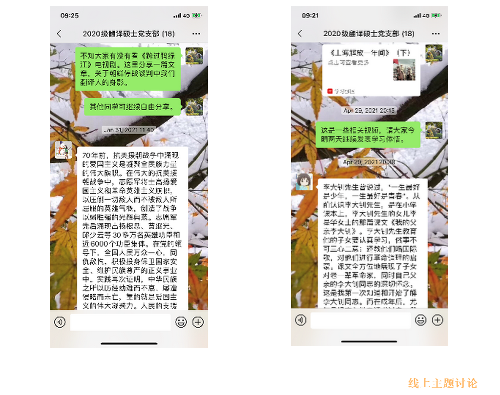 党支部始终将政治建设放在党支部建设的首位,坚持“三会一课”制度,坚持用党章党规规范党支部和党员行为,用习近平新时代中国特色社会主义思想武装头脑、指导实践、推动工作。支部根据学校和学院党委的统一部署,扎实开展“四史”学习教育和党史学习教育,组织安排策划了“共产党员的初心:翻译工作者的使命”“学习习近平谈治国理政第三卷”“学习进博会相关文件和志愿者先进事例”“脱贫攻坚,教育先行”“从世界社会主义运动史看中国特色社会主义事业的伟大意义”“学习习近平在纪念五四运动100周年活动上的讲话”等一系列专题学习。在这些学习活动中,支部党员不仅聆听学习,而且积极参与讨论,分享观点。比如有的党员同学分享本科时期在海南国家级贫困县参与定点扶贫的经验,引导支部党员认识脱贫攻坚的重要性;有的支部党员分享参加进博会志愿工作的体会,引导支部党员树立“四个自信”,增加外语人运用语言特长服务社会的责任与担任。此外,支部还积极利用线上平台,定期发起主题讨论,督促成员进行主题学习,获得了支部党员的积极响应。