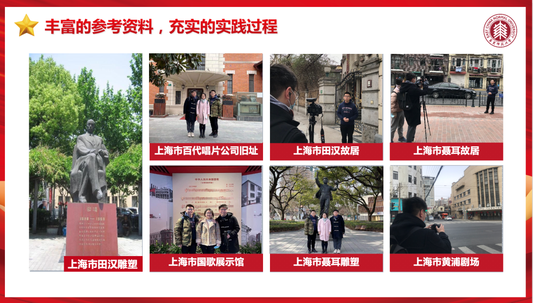 该项目启动于今年寒假期间。项目组的六位成员在深入查阅了关于义勇军进行曲诞生发展相关的学术文献和专著后,梳理了视频拍摄的逻辑,撰写了拍摄脚本,经过一次次指导与修改后,脚本最终定稿。随后,成员利用寒假时间,在冯烨老师的带领下,走访了位于上海的国歌展示馆、黄浦剧场、田汉故居、田汉雕塑、聂耳故居、聂耳雕塑、百代唱片公司旧址等地进行实地拍摄,寻访国歌诞生的红色足迹,探索国歌唱响的故事。
