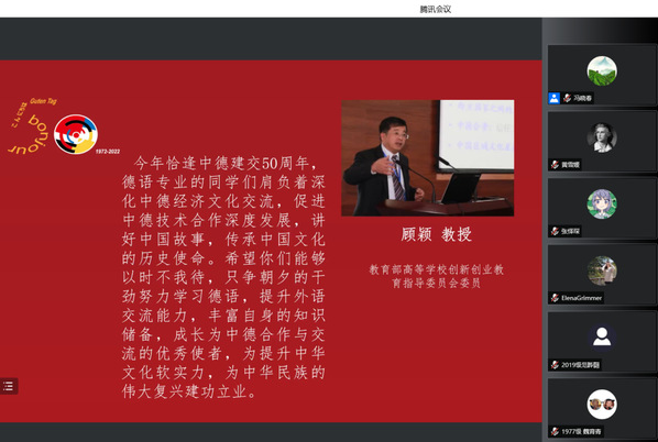教育部高等学校创新创业教育指导委员会委员顾颖教授发来贺信,赞赏了德语专业成立以来在人才培养上、尤其是在学生创新创业能力培养上取得的斐然成绩,并基于自己作为创新创业教育专家的经验和bwin必赢国际中国官方网站德语专业的优势,为德语专业未来的发展提出了一系列切实的建议。他也表达了对德语专业同学厚重的期望,希望同学们牢记讲好中国故事的历史使命,努力学习德语,争做中德合作与交流的优秀使者。
