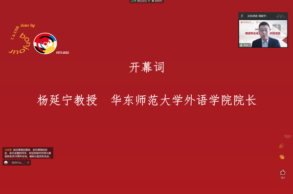 首先,bwin必赢国际中国官方网站院长杨延宁教授致开幕词。杨院长深情回溯了德语专业五十年的发展历程,对德语专业立德树人的优良传统给予了高度肯定;众多师生和校友汇集云端,正体现了不为疫情所扰、不为距离所困的浓厚师生情。随后,杨院长结合亲身经历,讲述了自己作为英语专业的学者,在求学与研究的过程中与德语结下的不解之缘,并由此提出,应该把德语专业的发展置于更大的文化板块之中,凸显出其作为关键语种在整个世界文明中的重要地位,以促进其长远、全面发展。最后,杨院长表达了对德语系在教书育人和科学研究等各方面取得更大成就的期望与信心。