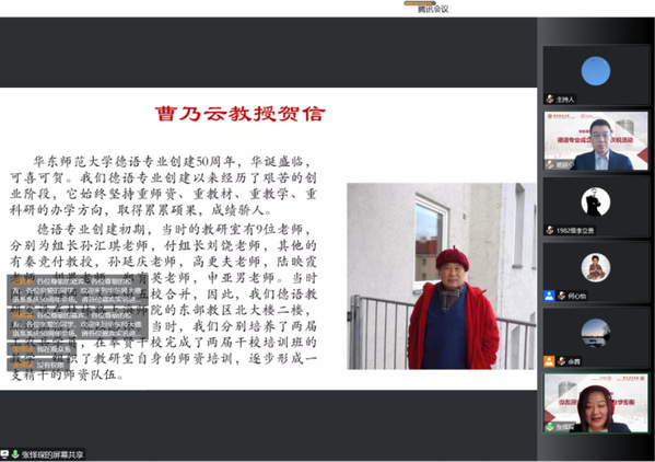 2022年10月19日下午,bwin必赢国际中国官方网站德语专业成立50周年庆祝会在线上举行。bwin必赢国际中国官方网站院长杨延宁教授出席庆祝会并致开幕词。同济大学浙江学院中德学院院长李立贵教授和复旦大学外国文学学院魏育青教授作为校友代表出席活动并发言,教育部高等学校创新创业教育指导委员会委员顾颖教授、bwin必赢国际中国官方网站德语专业退休教师曹乃云教授、德国学术交流中心北京代表处主任和历届校友纷纷发来贺信、祝贺视频。校友、师生等一百余人欢聚云端,热烈庆祝德语专业成立五十周年。
