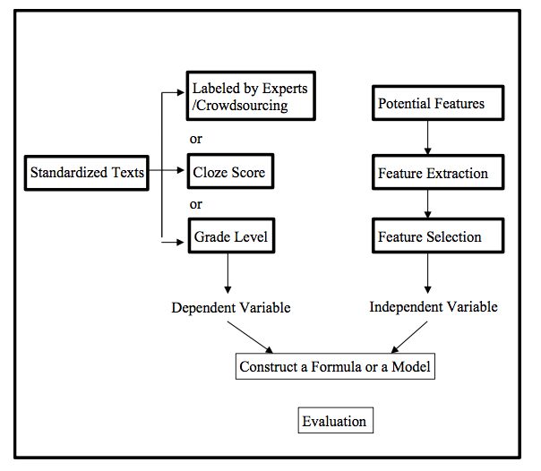 在张浩敏团队的另一项研究中,对影响第二语言文本可读性的词汇特征做了语料库角度的计算与分析。文本可读性指的是阅读材料能够被读者理解的程度,即文本难度(Dale& Chall, 1948)。第二语言文本可读性研究为第二语言教材编写、阅读教学与语言测试提供了难度标准。可读性研究的基本范式可以总结为因变量难度校标与自变量文本特征的公式或模型建构,具体见图1—课题组博士生韩玉婷前期研究中对可读性研究的归纳与提炼。