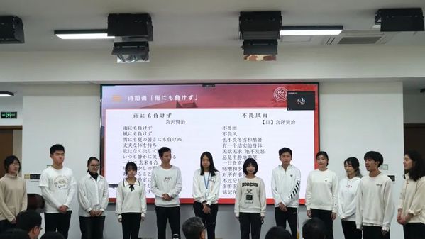 日语系一年级的学生们也通过诗朗诵和合唱节目为日语专业成立五十周年送上了祝福。日语系2022级王弈烜等12位同学用中日双语朗诵了宫泽贤治的名作《不畏风雨》(雨にも負けず),随后2022级的陈奕涵等8位同学带来日本的经典童谣《故乡》(ふるさと),在深情的朗诵与悠扬的歌声中,一年级学生们不仅表达了对日语系生日的祝福,也传达出了自己对日语的热爱以及学好日语的决心。