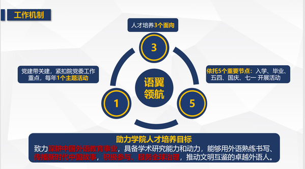 会上,江宇靖表示关工委工作应强化平台建设,有序推进关工委各项工作开展,着力打造工作品牌,并与关工委老师讨论了我院关工委工作的品牌——“语翼领航一三五”,通过党建带关建,紧扣院党委工作重点,每年关工委工作围绕1个主题活动开展;关工委助力我院人才培养的3个面向,即培养深耕中国外语教育事业、服务全球治理,推动文明互鉴以及其他领域外语卓越人才;全年依托5个重要节点:新生入学、毕业生离校、五四青年节、国庆节、七一建党节开展活动,加强学生思想政治教育,引领学生积极正面的价值观塑造,深化育人功效。