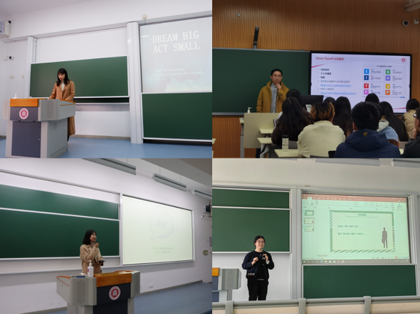 2022届英语专业本科毕业生黄晓琪以“Act small,dream big”为主题,向英语专业大二大三学生分享学习成长经验,勉励同学们在大学中不给自己设限,敢于试错、大胆突破。2021届法语专业本科毕业生初芝宏等校友结合自己参加学科竞赛和创新创业项目的经历,就如何备赛、确定科创题目、推进项目、跨专业学习等方面给出了自己的建议。2017届德语专业焦小桐现就职于“蜻蜓FM”任项目运营主管,她从职场工作的视角向“准毕业生”介绍了职场达人的养成之路,鼓励毕业年级同学在求职道路上稳步前行。