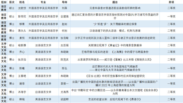 最终,语言教育组共产生了硕士一等奖一名,博士二等奖三名,硕士二等奖一名。文学文化组共产生了博士一等奖两名,博士二等奖四名,硕士二等奖两名。