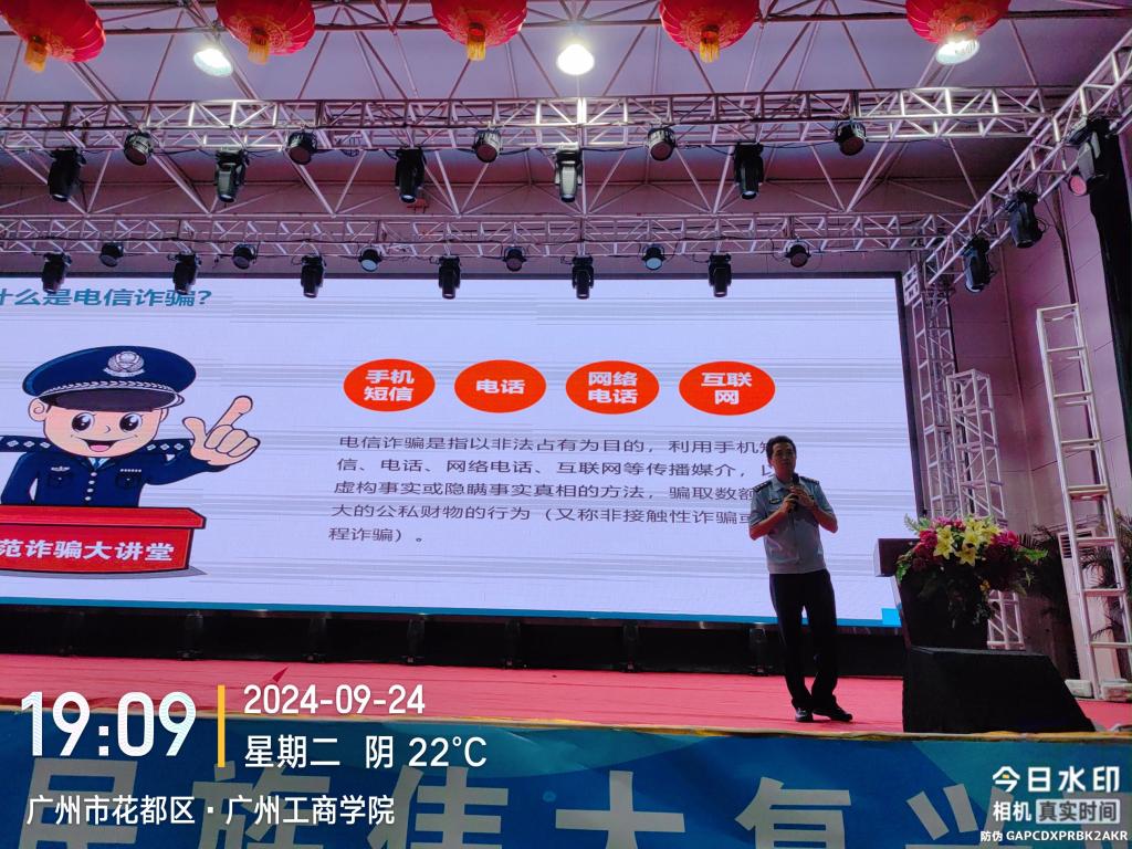 【本网讯】为了提升新生的防范诈骗意识,保护学生从财产安全,9月24日晚,kaiyun特要合益派出所黄刚、钟毅国警官等在花都体育馆举办“校园开学季反诈专题宣传”讲座。花都校区各学院新生共计1000多名师生代表参加了本次讲座。