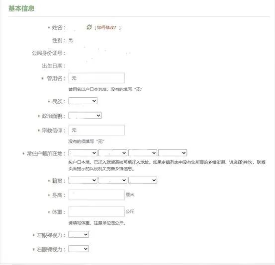 5. 进入信息填写页,依次完善以下内容:民族、政治面貌、常住户籍所在地、籍贯、婚姻状况、学历信息(含学历、学业情况、学校名称、所学专业)、从业类别、职业资格证书、户籍类别、是否独生子女、联系电话(本人及家庭电话)、家庭住址等,填写完成后点击“提交”,兵役登记即完成。