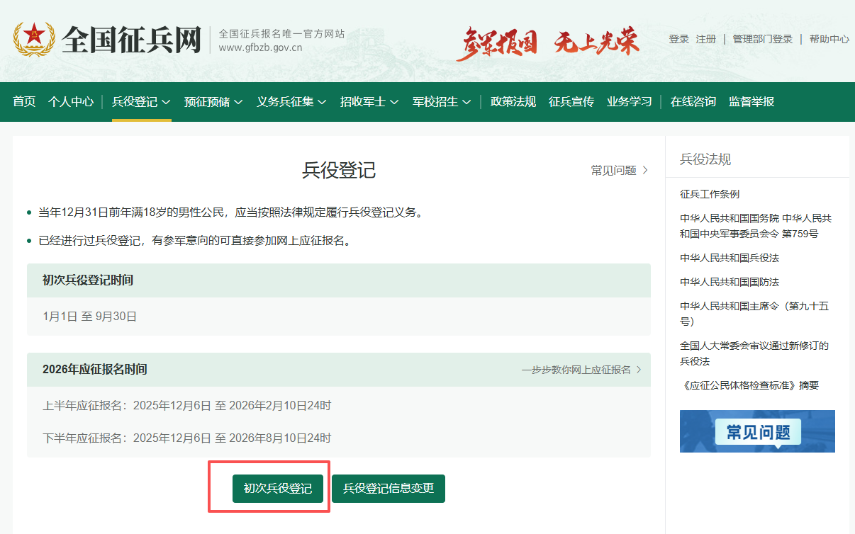 2. 进入页面后,会显示报名时间及参军政策说明,建议仔细阅读后,点击“初次兵役登记”,开启军旅报名第一步。