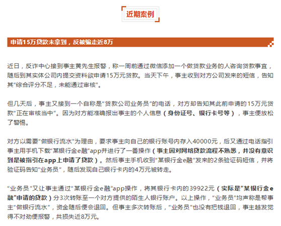 广州市公安局新闻办公室(11月21日)通报:广州市反诈中心根据实时警情监测分析,近期网络贷款类诈骗警情突出。年关将近,反诈中心提醒,各位资金周转急需用钱的人士,网络贷款须谨慎,小心掉入网络贷款诈骗陷阱。