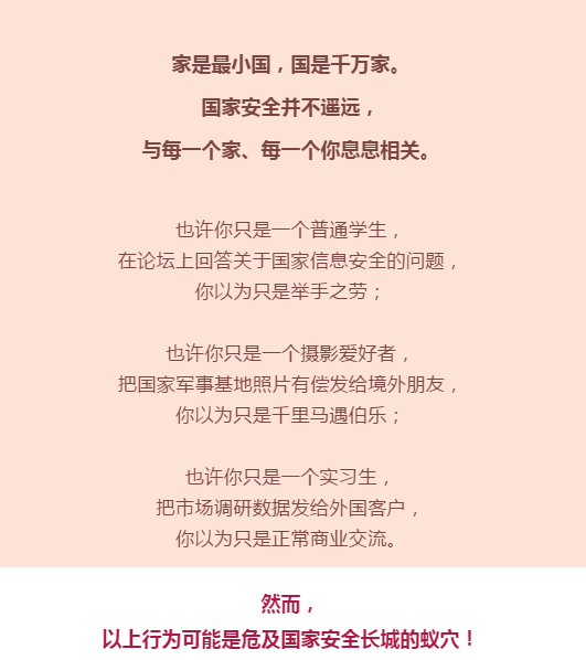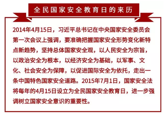 当我们在谈论国家安全的时候,我们究竟在讨论些什么?国家安全体系主要涉及哪些领域?哪些行为潜藏威胁国家安全的危险?今年4月15日是第四个全民国家安全教育日,让我们来简要普及一下国家安全常识。
