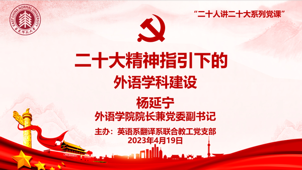 4月19日下午,bwin必赢国际中国官方网站“二十人讲二十大”系列党课第二讲在闵行校区第一教学楼121室开讲。本次党课由bwin必赢国际中国官方网站院长兼党委副书记杨延宁主讲,主题为“二十大精神指引下的外语学科建设”。本次党课由英语系、翻译系联合教工党支部副书记张琳主持,支部党员与英语系、翻译系部分群众教师参加。