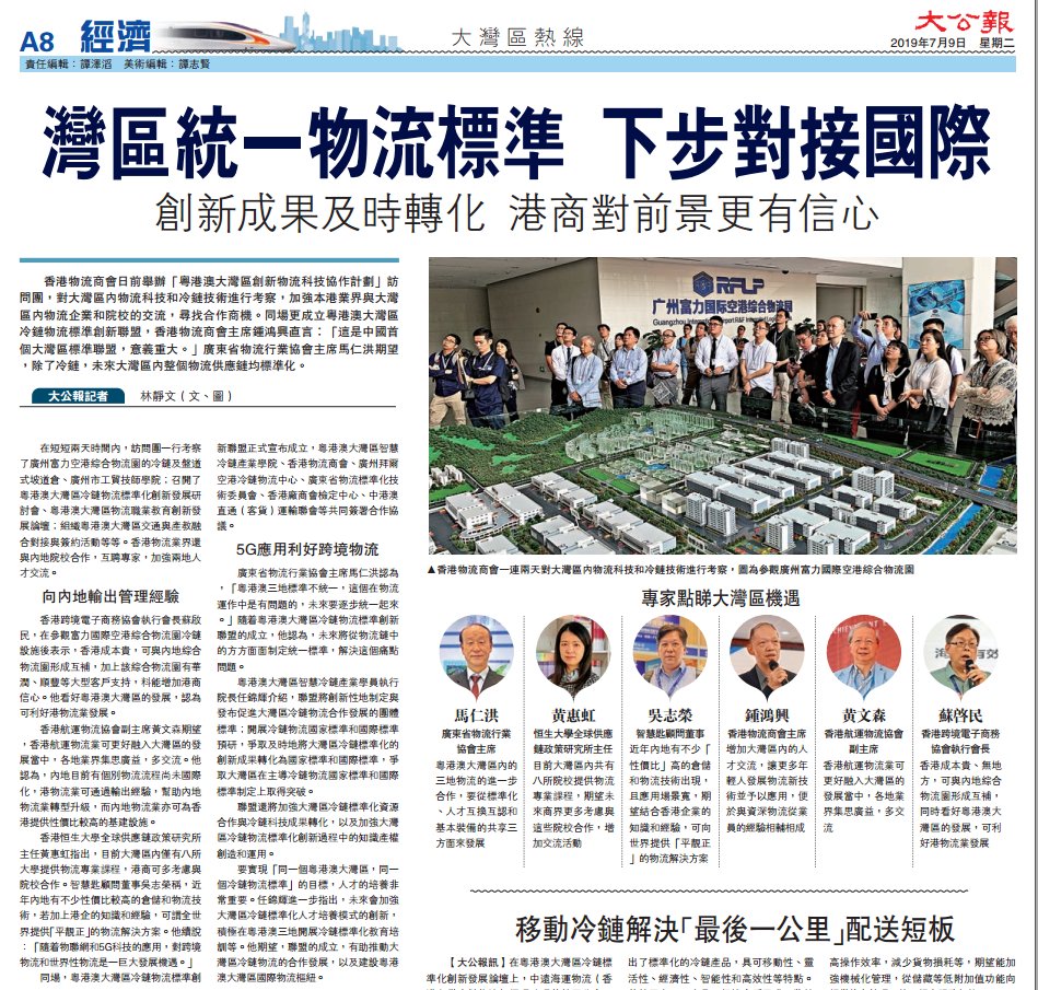 大公报介绍了粤港澳大湾区智慧冷链产业学院执行院长关于粤港澳大湾区冷链物流标准创新联盟背景、主要功能定位及“同一个粤港澳大湾区,同一个冷链物流标准”的目标。任锦辉院长同时指出准创新联盟将加强大湾区冷链相关专业人才培养模式创新,积极在粤港澳三地开展冷链物流标准化教育培训,从而推动大湾区冷链物流合作发展,建设粤港澳大湾区国际物流枢纽。
