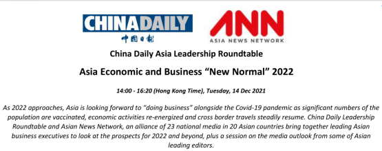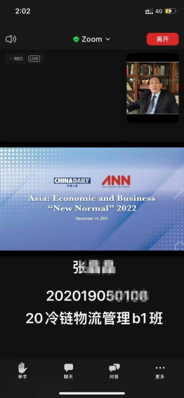 中国日报领袖圆桌会议和亚洲新闻网是一个由20个亚洲国家的23家国家媒体组成的联盟。12月14号,该联盟组织召开2022年亚洲经济和商业“新常态”论坛活动,本次会议汇聚了亚洲主要企业高管,大家共同探讨2022年及未来的经济和商业发展前景。冷链产业学院董事、香港物流商会主席钟鸿兴应邀作为主要嘉宾参与该会议并进行发言演讲。冷链产业学院亦利用共建单位资源优势,组织学生完成线上登记后参加本次会议进行学习。