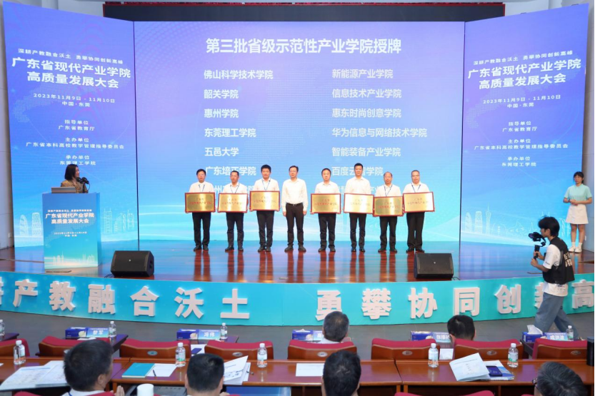 在全场参会代表的见证下,广东现代产业学院发展联盟正式成立。该联盟由省内参与现代产业学院建设的高校、企业、行业组织等单位组成,以国家产教融合、新发展理念为指导,共同开展现代产业学院建设理念、方法和模式探索实践,引领我省现代产业学院建设,培养大批现代产业发展需要的高素质应用型、复合型、创新型人才,为广东省产业竞争力提升和汇聚发展新动能提供人才支持和智力支撑。同时大会发布了《广东省高质量建设现代产业学院的共识(广东共识)》。