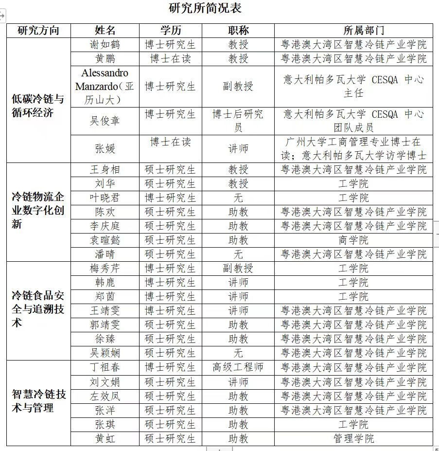 研究所负责人为粤港澳大湾区智慧冷链产业学院执行院长谢如鹤教授,成员来自学校相关学科的专任教师,同时与意大利帕多瓦大学工业工程研究所开展科研合作。研究所现有25名研究人员,其中博士9人,高级职称8人。