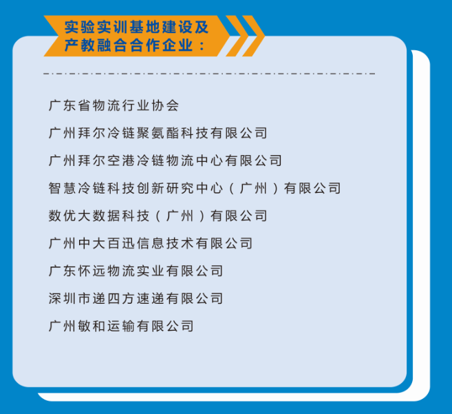 与广东省物流行业协会广东省冷链物流公共信息平台、广州拜尔冷链物流中心有限公司、广州精益集团等单位组建冷链物流公共实验实训基地。