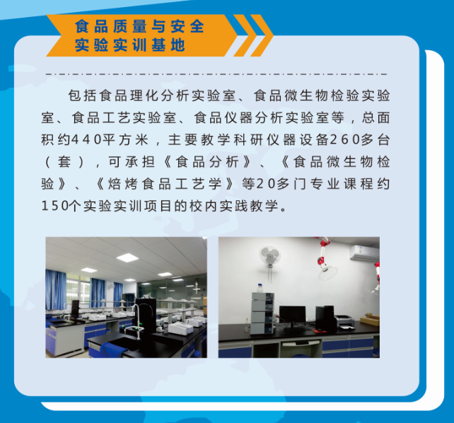 实验实训及基地包含物流综合实验实训室、物流信息技术实验室、物联网及其应用实验室、冷链物流设备实验室、食品微生物实验室(冷链物流)、食品理化分析实验室(冷链物流)、食品工艺实验室、冷链物流大数据平台等8个实验实训室构成。