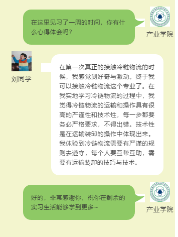 2020年暑期社会实践,产业学院提供了一些冷链物流企业资源供让同学们到企业参加见习活动,同学们通过见习、学习巩固了在校学到的专业知识,加深了对冷链物流行业的了解,为以后进入社会做好铺垫。