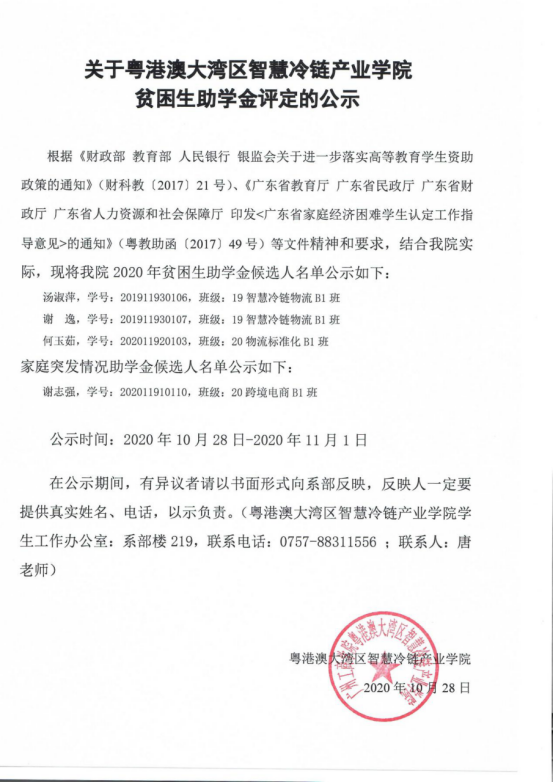 关于粤港澳大湾区智慧冷链产业学院贫困生助学金评定的公示