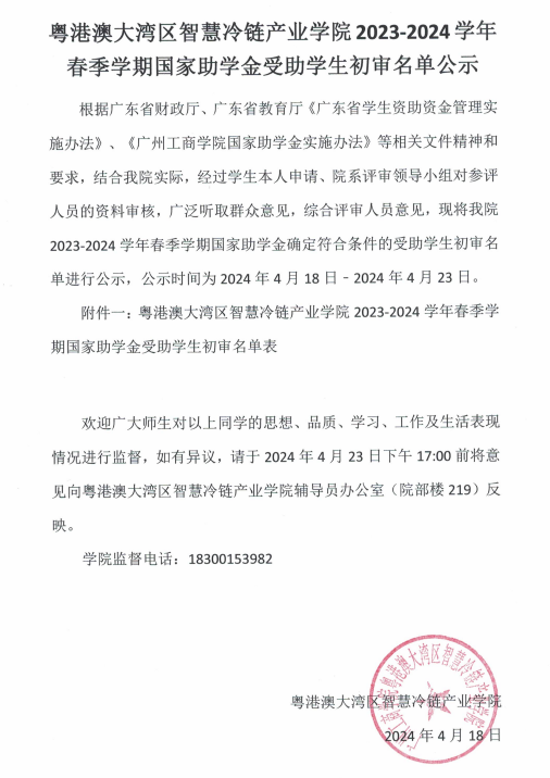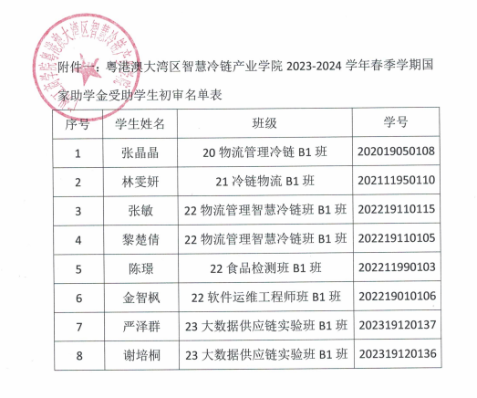 粤港澳大湾区智慧冷链产业学院2023-2024学年春季学期国家助学金受助学生初审名单公示