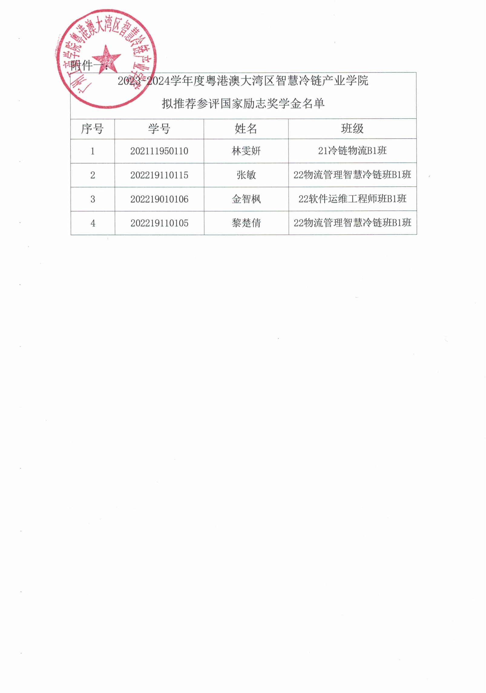 2023-2024学年度粤港澳大湾区智慧冷链产业学院拟推荐参评国家奖学金公开评选名单公示