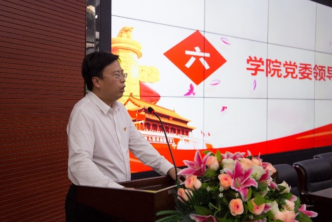 学院党委副书记、院长助理黄鹏讲话。他提出,同志们要居安思危,在日常的学习和生活中做到不忘初心、牢记使命,勇做我们伟大祖国的建设者和保卫者,希望同志们能进一步端正党的动机,坚持践行学院“德学”教育理念和“五进”活动,坚定信念跟党走,争取早日成为党旗下的优秀党员。