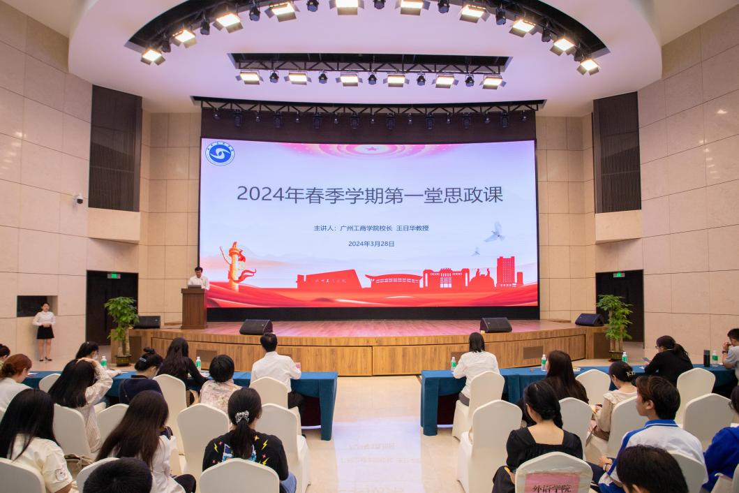 【本网讯】为贯彻落实教育部等十部门《全面推进“大思政课”建设的工作方案》精神,推动落实学校党组织书记、校长思政课建设“第一责任人”责任,按照《广东省教育厅关于做好2024年春季学期大中小学校党组织书记、校长上第一堂思政课工作的通知》要求,3月28日下午,由校长王日华教授主讲的“中国式现代化与广东实践”第一堂思政课活动在花都校区举行。本次活动由马克思主义学院、党办、学工部、校团委与张辉名师工作室联合举办,校团委书记洪卫烈主持,马克思主义学院教师代表、辅导员代表与学生代表到场参加。