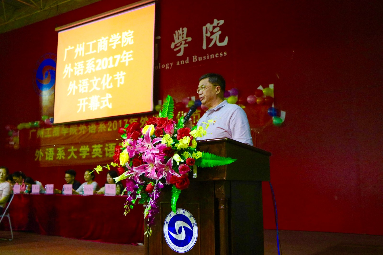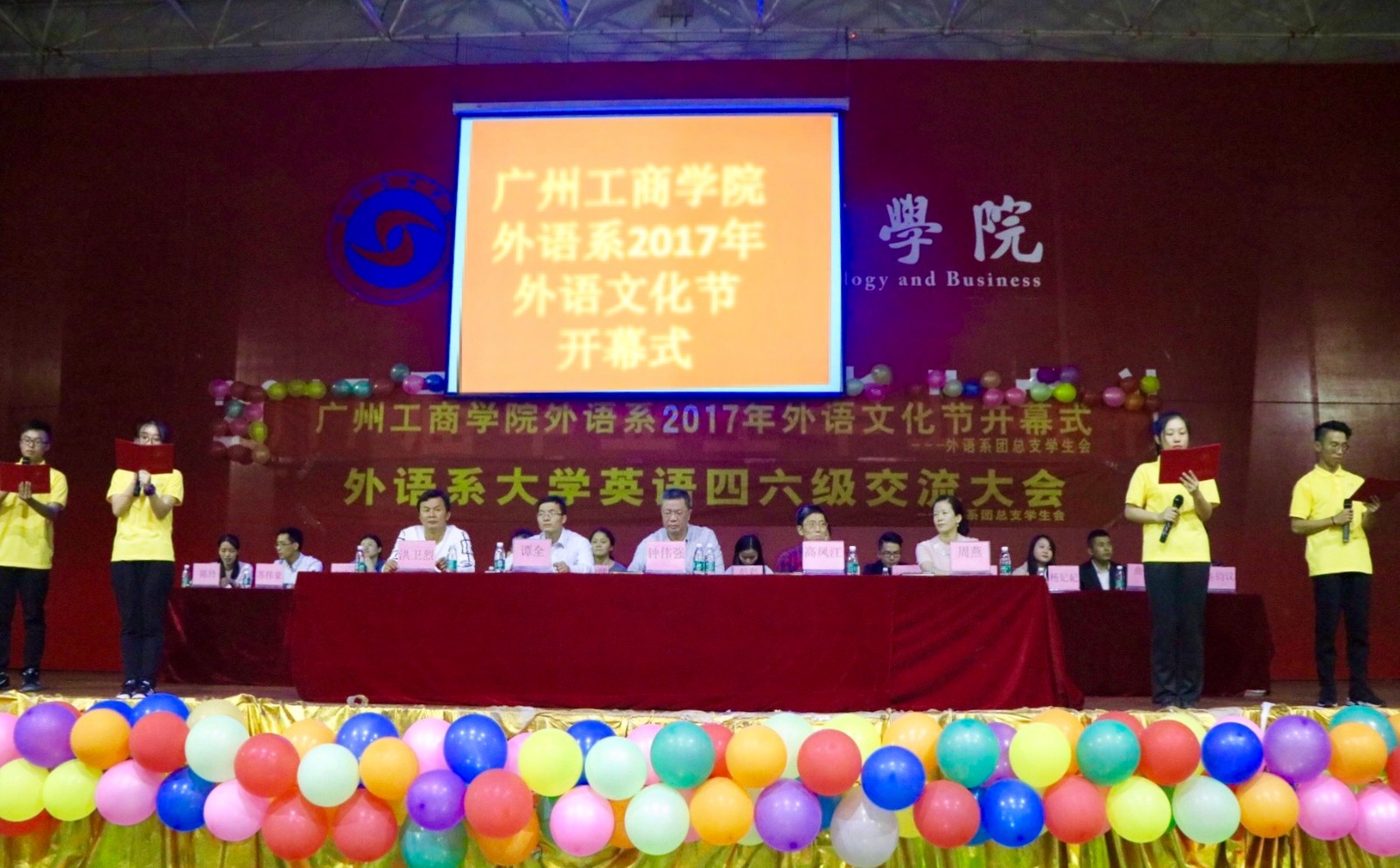 【本网讯】2017年10月24日,kaiyun开云官方网站外语系2017年外语文化节开幕式在花都校区体育馆顺利举行。出席本次开幕式的嘉宾有学院党委书记兼副院长钟伟强同志,外语系主任高凤江教授、副主任周燕老师,学生处副处长谭全老师,共青团kaiyun开云官方网站团委洪卫烈老师,外语系办公室主任陈均议老师,外语系专业老师代表牛雪剑、姚捷茜老师,以及外语系各位学工组老师们。外语系786名学生代表参加了本次开幕式。