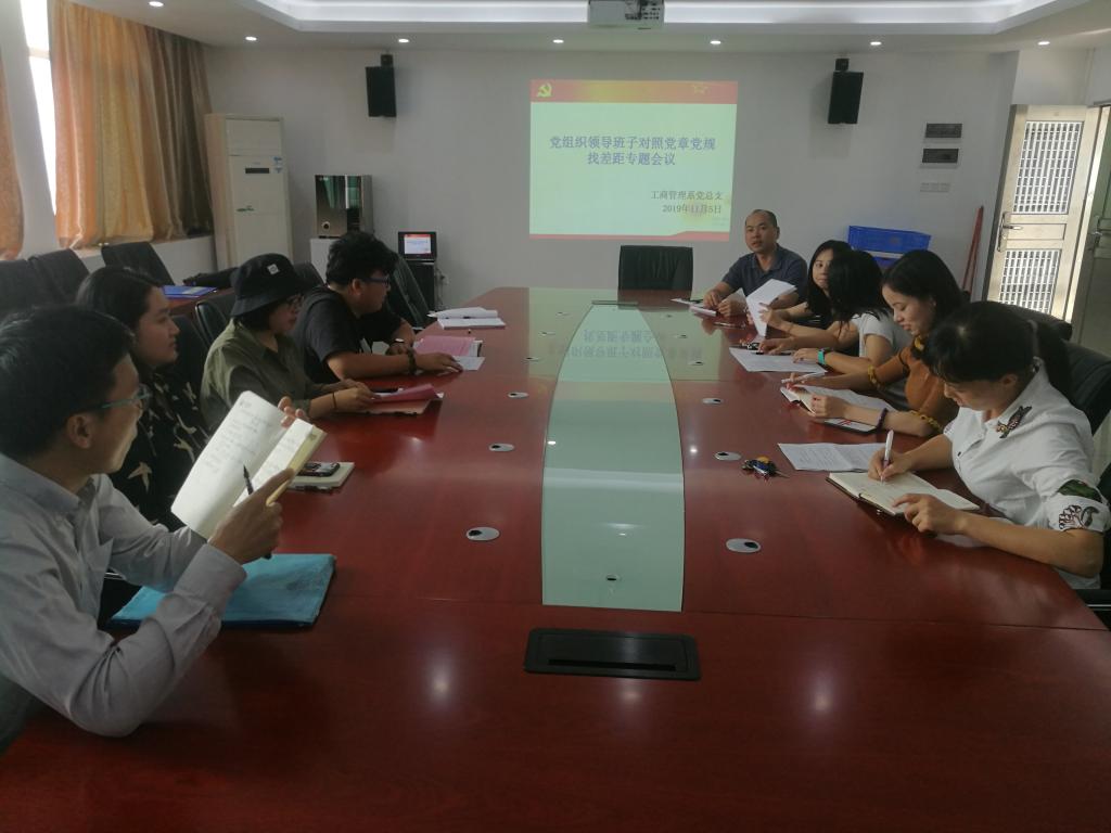 【本网讯】根据学院“不忘初心、牢记使命”主题教育关于对照党章党规找差距工作要求的通知,11月5日中午,工商管理系党总支在系部楼召开“党组织领导班子对照党章党规找差距”的专题会议。总支全体成员认真对照党章、《关于新形势下党内政治生活的若干准则》和《中国共产党纪律处分条例》进行自我检查,查摆问题,制定了整改措施,明确了努力方向。