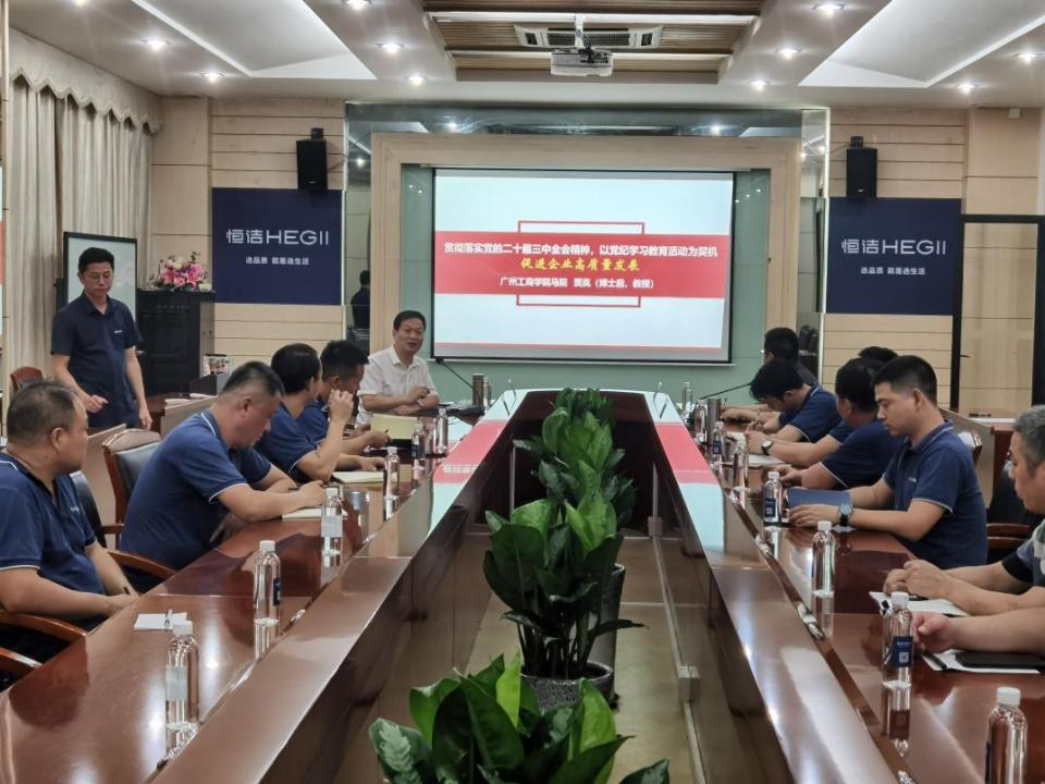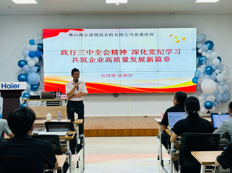 在企业,宣讲团与佛高区三水园产业社区党委协同共建“全会精神进企业”专题培训班,深入佛山市广东邦普循环科技有限公司、佛山海尔滚筒洗衣机有限公司、广东星星制冷设备有限公司、恒洁卫浴集团有限公司、广东天元汇邦新材料有限公司和佛山海尔电冰柜有限公司开展培训。期间,朱青山副教授作《深刻领会党的二十届三中全会精神持续深化党纪学习教育——不断推动企业高质量发展》主题报告,范国增副教授作《践行党的二十届三中全会精神深化党纪学习教育共筑企业高质量发展新篇章》讲座,贾兰教授在《党的二十届三中全会精神引领融合党纪学习教育——共促企业高质量发展新篇章》主题党课中,紧扣党建赋能企业高质量发展这一主线,为企业贯彻落实全会精神,实现高质量发展提供了明确方向和行动指南。