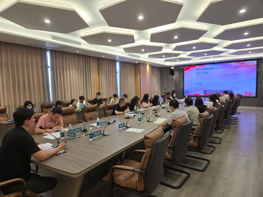 On May 8, the institute held a theoretical study session for the Party Branch Central Group, combined with a faculty ethics and professional conduct education meeting, in Room 806 of the Third Comprehensive Building. The meeting was chaired by Huang Zhecheng, Secretary of the Party Branch. It aimed to fully implement the spirit of the Central Party’s Eight-Point Regulations, strengthen the construction of teacher ethics and conduct, continue advancing strict governance of the Party at the grassroots level, and further enhance the ideological and political awareness and professional ethics of the faculty, thereby laying a solid foundation of thought and discipline for the high-quality and connotative development of the institute.