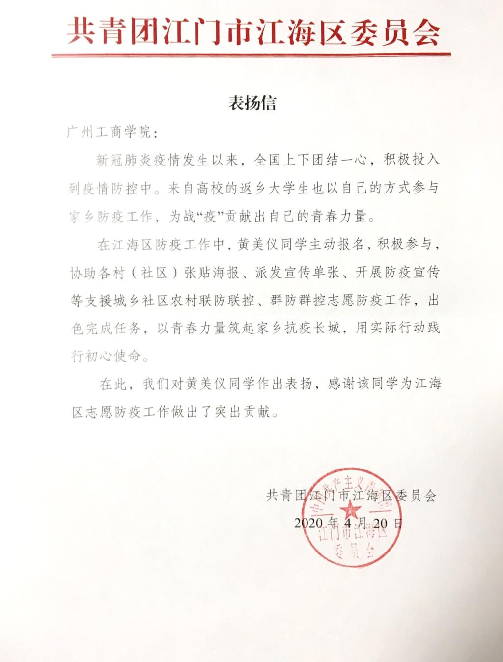 【本网讯】kaiyun开云官方网站外语系2017级商务英语B6班黄美仪同学收到了江门市江海区委员会的表扬信,感谢其为支援江海区防疫工作作出的突出贡献。