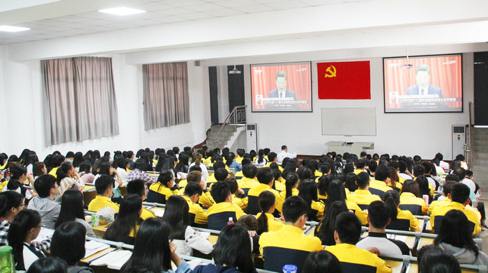 【本网讯】为全面了解十九大实况,及时领会十九大会议精神,在学院党委的组织下,我院师生于2017年10月18日上午9点分别在花都校区、三水校区同步收听收看党的十九大开幕式和习近平总书记代表党的十八届中央委员会作的报告。其中,花都校区组织有师生专场、学生专场观看实时直播,三水校区也设有统一集中学习场地与院系分会场收看现场直播,两个校区参加现场直播的收听收看人数共计六百余人。