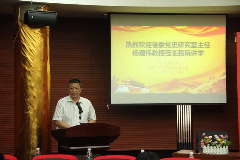 【本网讯】为加强我院党政领导干部和党员对中央“治国理政”新理念、新思想、新战略的学习和认识,2016年10月14日上午,学院邀请广东省委党史研究室主任杨建伟教授来我院,以学习贯彻习近平总书记全面从严治党战略思想为主题,为我院师生做了一场精彩的辅导报告。党委书记钟伟强主持了会议。学院中层以上干部、党务干部、甘南挂职培训老师及学生代表认真听取了本场讲座。