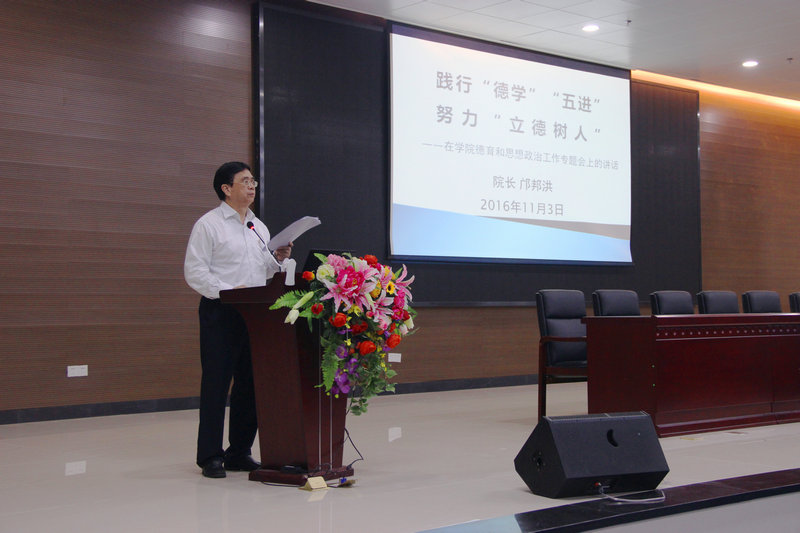 院长 邝邦洪教授在会上作了《践行“德学”、“五进” 努力“立德树人”》的重要讲话。他充分肯定了本次会议的重要意义,以及院党委和思政部、学生处、团委、系部等部门在开展“德学”修养、“五进”实践活动中所取得的各项成绩。就如何进一步加强和改进新形势下学校大学生思想政治教育工作,努力把我院思想政治工作提高到一个新水平,邝院长提出了两点意见和建议:一、进一步认识开展“以德为行 以学为上”教育理念活动和“五进”实践活动的重要意义。二、进一步加强思想政治工作,努力为“立德树人”谱写新篇章。2014年5月4日,习近平总书记在北京大学师生座谈会上强调,广大青年在树立和培养社会主义核心价值观时,“要修德,加强道德修养,注重道德实践”,“要勤学,下得苦功夫,求得真学问。”习近平总书记系列重要讲话精神就是进一步强调了“德学”修养的重要性,邝院长希望大家认真学习习近平总书记系列重要讲话精神,齐心协力,辛勤耕耘,打造“德学”、“五进”的育人品牌,育人特色,为我院创建高水平应用型大学做出新的贡献!