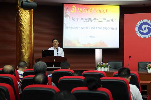 钟书记的党课主要讲了三个方面的内容:一是“三严三实”的提出及其主要内容。习近平总书记提出的“三严三实”是作风建设的新要求,应该用全面、联系、发展的观点来看“三严三实”专题教育。二是正确认识,深刻领会“三严三实”的丰富内涵和重大意义。钟书记指出:“三严”侧重于内在要求,其指向是主观世界的改造,重点是修身、律己。“三实”侧重于行为取向,其指向是客观世界的改造,重点是谋事、做人。要求全体党员和领导干部要在坚定理想信念上、坚持公道正派上、廉洁自律上、加强道德修养上、日常工作上下功夫。三是努力践行“三严三实”,促进学院各项工作再上新台阶。对于领导干部和党员,要突出一个“带头”,整治“不严不实”问题,做到“边学边查边改”,注重五项“结合”,在以身作则上见表现,在遵规守矩上见行动,在整改落实上见实效。