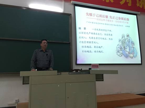 讲座伊始,钟伟强书记就先慎于己而后彼 先正己身而后治是对“一名优秀学生干部的最基本要求”,“优秀学生干部的基本素质和条件”,以及“如何当好一名优秀的学生干部”三个方面进行讲述。他指出:作为一名优秀的学生干部首先要政治合格,要求上进;其次要抓好自己的主页,要有责任心和工作热情,为人公正、做事公道;要有服务的意识,具备“四勤”;要清晰自身的定位,学生干部是学校管理的参与者,是同学们的代表,是学校和老师在学生管理中的得力助手,是学生活动的主要组织者和策划师;要具备良好的组织协调能力。同时他要求:要成为一名优秀的学生干部必须要加强学习,追求理想,注意自身的形象,处处起好表率作用,做好学习和生活的模范;要自觉加强自身的“德学”修养,做“五进”活动的实践者和带头人;要牢固树立服务意识,成为同学和学校、同学和老师、同学和同学之间沟通、交流的重要桥梁;要提高自身工作能力,积极履行大学生“三自管理”的责任和担当,当好学生和老师的得力助手;要不断地加强自身的修养,提高个人的综合能力。
